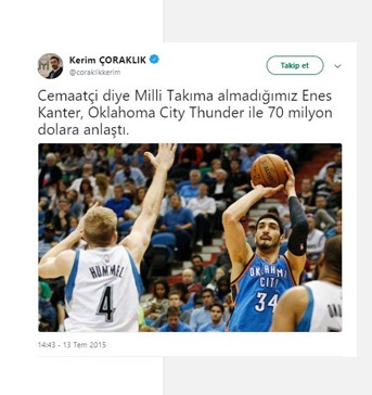15 Temmuz darbe girişiminin ardından Türkiye aleyhine paylaşımlar ve sözler sarfeden FETÖ üyesi Enes Kanter'e destek mesajında "Milli takıma almadığınız Kanter, Oklahoma City Thunder ile 70 milyon dolara anlaştı" şeklinde sosyal medyada paylaşım yaptı.