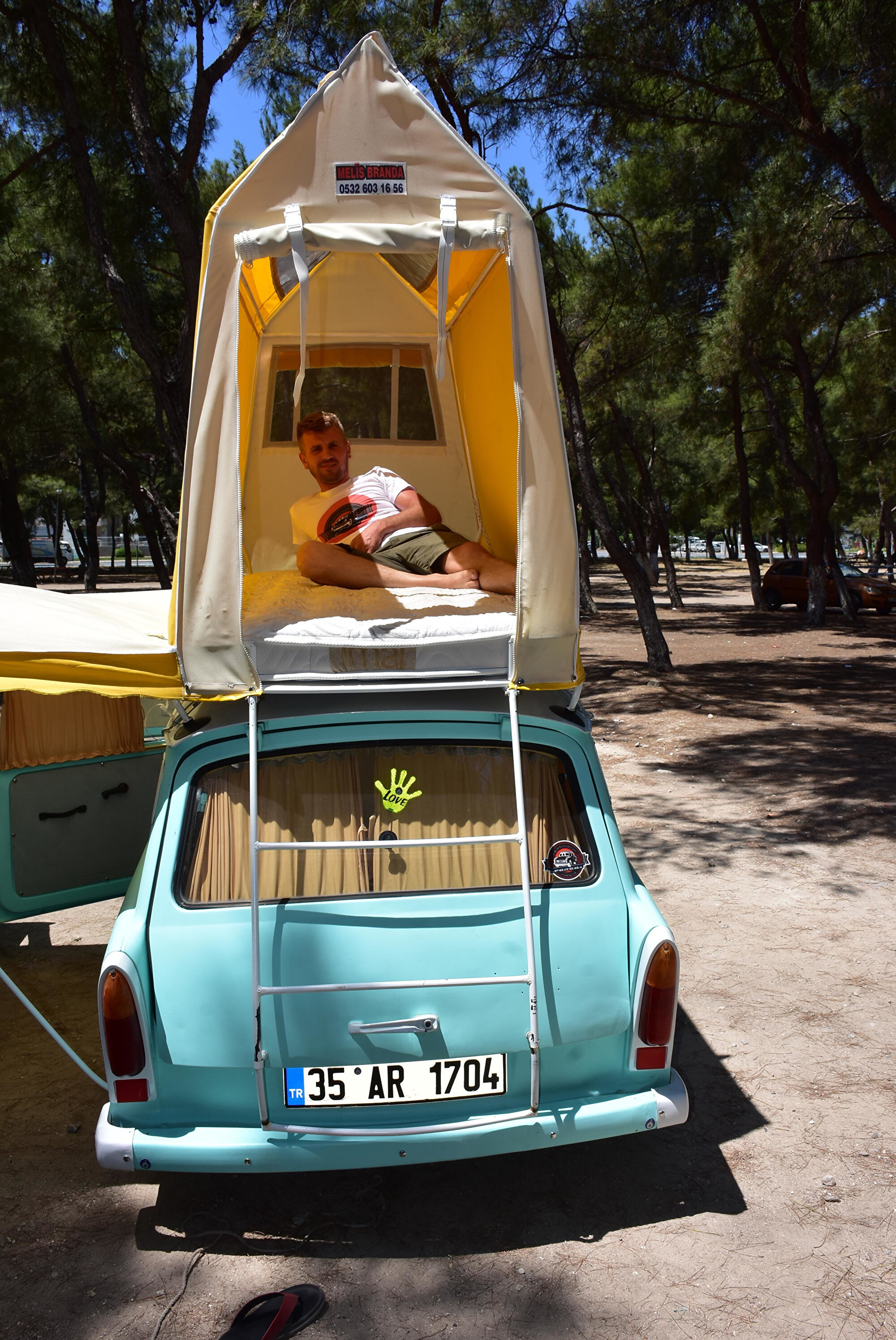 Oto elektrik ustası Mehmet Ardil'in yaptığı karavan, ilgi çekti. Ardil, çok sevdiği klasik otomobili hem çekici hem de arkasına taktığı çekme karavanda kullandı. Karavanın ayrıca üstüne yerleştirdiği çadırla, ek yatak alanı daha ekledi.
