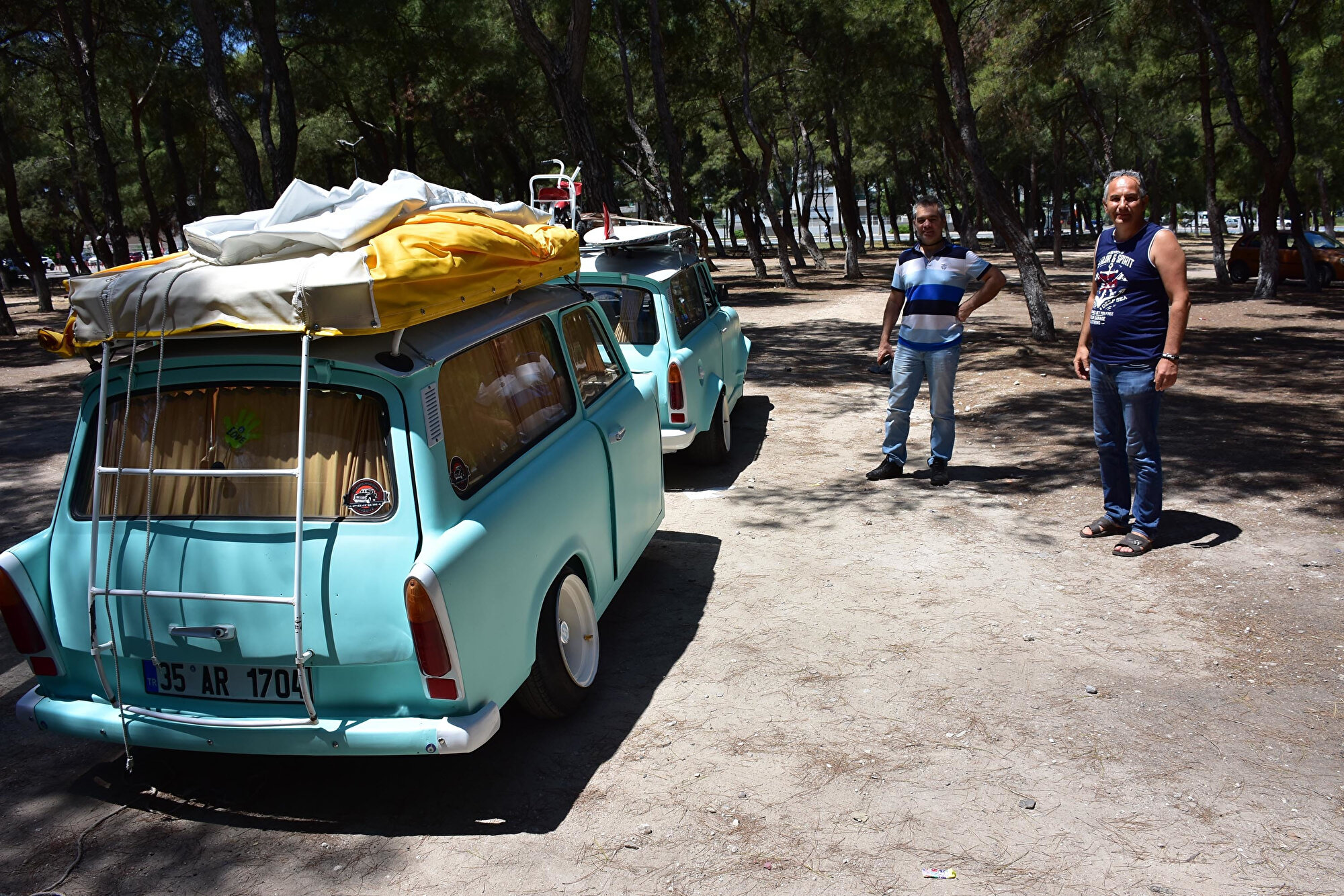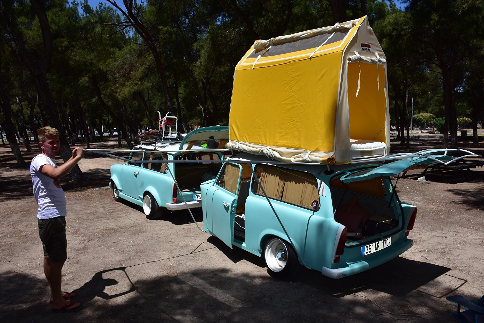İzmirli oto elektrik ustası Mehmet Ardil (35), Doğu Almanya üretimi klasik otomobilden çekme karavan yaptı. Öndeki çekici otomobili de aynı araç olan karavan ilgi gördü. Ardil, koronavirüs salgını döneminde karavanıyla izole tatil yapmanın rahatlığını yaşadığını belirterek, "Bu otomobil artık üretilmiyor. Klasik bir araç. Geri dönüşümden bir araç. Dış aksamları komple duroplast. Çürümüyor. Yazın serin, kışın ise sıcak tutuyor. Öndeki çekici araç 1991 model, sonrasında üretim duruyor zaten" dedi.