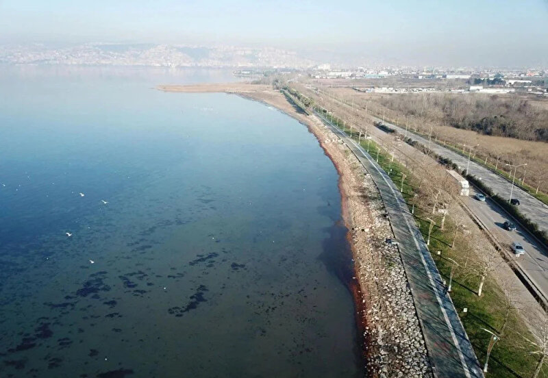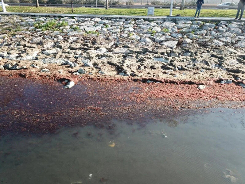 İzmit Körfezi'nin sahil kesimleri kırmızıya büründü. Sahili kaplayan kırmızı yosunlar dikkat çekerken uzmanlardan açıklama geldi.