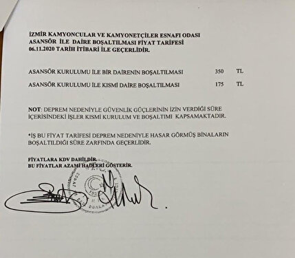 İzmir'deki deprem sonrası evlerini taşımak isteyenlerden yüksek fiyatlar talep eden bazı nakliyecilere valilikten uyarı geldi. İzmir Valiliği, belirlenen fiyata uymayanlara cezai işlem uygulanacağını bildirdi.
