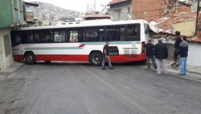 İzmir’in Konak ilçesinde, seyir halindeyken su birikintisinden kayan belediye otobüsü, karşılıklı 2 evin duvarını yıktı. Kazada otobüs içinde bulunan 6 kişi hafif yaralanırken, duvarı yıkılan bir evdeki kadın ise kazaya uykusunda yakalandı. Kaza anlarını anlatan Emine Kızılçınar, “Kaza sırasında yan odada uykudaydım. Deprem olmuş, bomba patlamış gibi bir ses duydum ve kendimi bağırarak dışarı attım. Dışarıya çıktığımda otobüsün evin duvarını yıktığını gördüm. Onu görünce sanki dünyada değilmişim gibi elim ayağım titremeye başladı" ifadelerini kullandı.