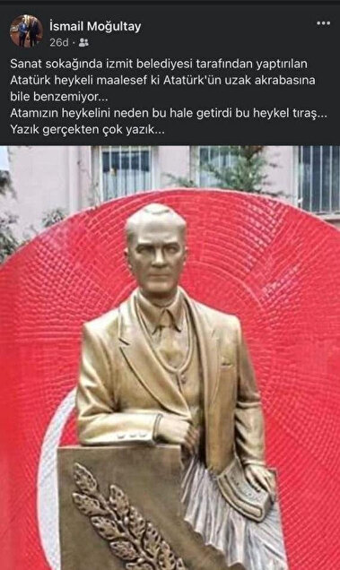 CHP'li İzmit Belediyesi, geçtiğimiz aylarda Sanat Sokağı'ndaki Atatürk heykeli yapılmasına karar vermiş, tasarlanan alternatifler halk oylamasına sunulmuştu. Beğenilmediği için kaldırılan heykelin yerine yenisi sonu yine hüsranla bitti. İkinci heykelin de Atatürk'e benzememesi vatandaşlardan tepki topladı. İzmit Sanayi Mahalli Muhtarı İsmail Moğultay'dan "Maalesef ki Atatürk'ün uzak akrabasına bile benzemiyor." ifadelerini kullandı.