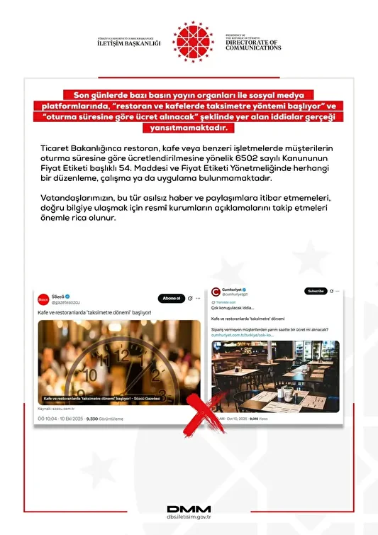 Bazı basın yayın organları ve sosyal medya platformlarında yer alan “restoran ve kafelerde taksimetre dönemi başlıyor” ile “oturma süresine göre ücret alınacak” yönündeki iddialar, Dezenformasyonla Mücadele Merkezi (DMM) tarafından yalanlandı.