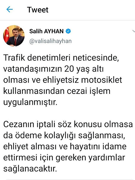 Evini geçindirebilmek için çabalayan gencin ceza yedikten sonraki üzüntülü hali görenleri de üzmüştü. Sevindiren haber ise Sivas Valisi Salih Ayhan’dan geldi. Ayhan, sosyal medya paylaşımında cezanın iptal edilmeyeceğini, ancak ödeme kolaylığı sağlanarak ehliyet alması için kendisine yardımcı olacaklarını duyurdu. Ayhan gencin ve ailesinin de hayatlarını idame ettirebilmeleri için kendilerine yardım yapılacağını belirtti. Vali Ayhan’ın bu açıklaması taktir toplarken takipçilerini ve gence üzülenleri sevindirdi.