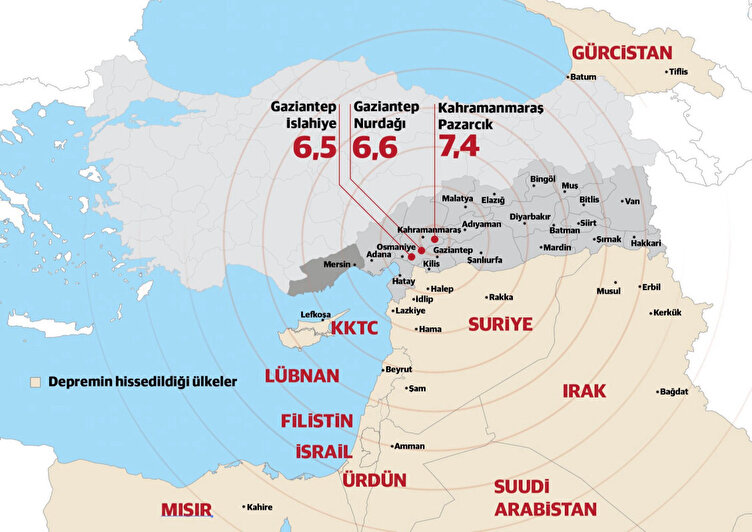 Kahramanmaraş ve Gaziantep başta olmak üzere bir çok ilde şiddetli bir şekilde hissedilen 7.4 büyüklüğündeki depremde acı bilanço ağırlaşıyor. Çevre ülkeleri de etkileyen deprem dünya basınında geniş yer bulurken depremden etkilenen ülkeler de belli oldu. Karamanmaraş'taki 7.4 büyüklüğündeki deprem Başta Suriye olmak üzere; Irak, Lübnan, Filistin, İsrail, Ürdün, Mısır,Suudi Arabistan, Gürcistan ve KKTC'de de hissedildi.