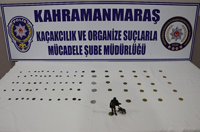 Kahramanmaraş’ta polis ekipleri tarafından bir kahvehaneye yapılan operasyonda çöp kovası içinde ‘Roma Helenistik Antik’ döneme ait olduğu değerlendirilen 88 adet sikke ve 2 adet heykelcik ele geçirdi.