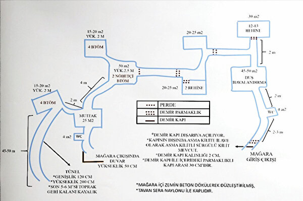 - İlk istihbarat verilerine göre, mağarada bir odada 12-13, diğer bir odada 2 olmak üzere toplam 14-15 rehine tutulduğu tahmin ediliyordu. Mağara terör örgütü tarafından hapishane olarak kullanılıyordu.Dere yatağında ve her iki yanında yüzde 60 meyilli olan, Hava Kuvvetleri’nin görerek ateş etme imkanı bulunmayan 3 girişli mağarada 7 demir kapılı yüksek korunaklı 9 oda bulundu. Yüksek korunaklı mağaranın 2 cm kalınlığındaki demir kapılar, beton zemin, sera naylonu ile kapatılmış tavanları ve çıkışında 50 cm yüksekliğindeki beton duvarla desteklendiği görüldü.Mağarada 120 cm’ye 200 cm boyutundaki tüneller, asma kilitli, sürgülü demir kapılar, 20 ila 35 m2 genişliğinde odalar, 50 m2 genişliğinde duş ve havalandırma bölümü tuvaletlere rastlandı. Bu mağara da Afrin’de karşılaşılan mağaralara benzerliğiyle dikkat çekti.