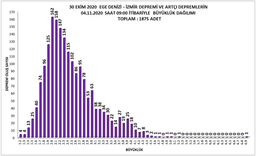 Kandilli Rasathanesi Twitter hesabından yaptığı paylaşımda, cuma gününden bu yana 1875 artçı depremin olduğunu duyurdu. Açıklamada şu ifadelere yer verildi: "30 Ekim 2020 saat 14:51’de Ege Denizi’nde Sisam adasının kuzeyi ile Doğanbey meydana gelen Mw=6.9 büyüklüğündeki depremin ardından 4 Kasım 2020 saat 09:00 itibarıyla bölgede 53 tanesi M =4.0 ve üzerinde olan toplam 1875 artçı deprem çözümü yapılmıştır"