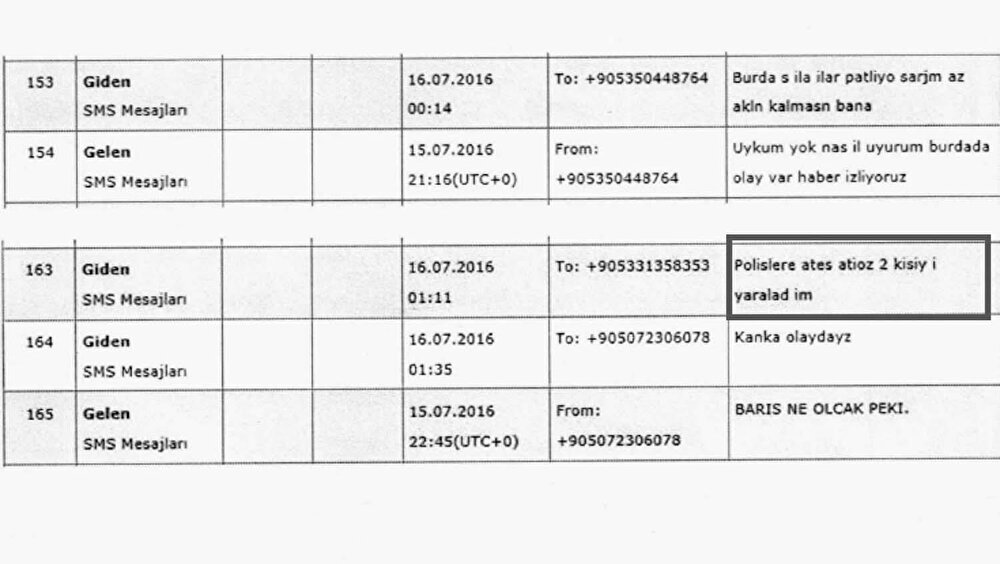 15 Temmuz’da darbecilerle hareket eden iki erin mesajlarına ulaşıldı. Sanık erler Koray Özdemir ve Barış Caner yakınlarına ‘polisle çatıştıklarını’ haber vermiş. Özdemir’in “İki polisi vurdum”, Caner’in ise bir arkadaşına “Kanka olaydayız” diye yazdığı tespit edildi.
