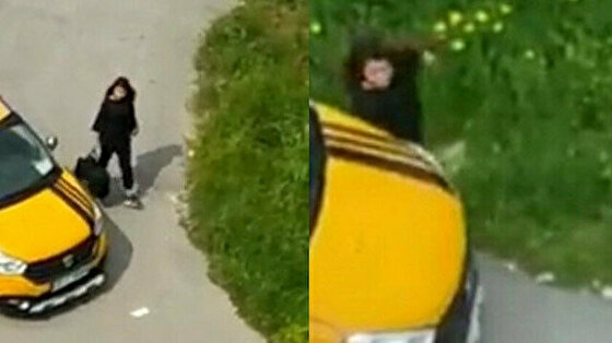 Sosyal medyaya yansıyan görüntülerde, elinde çanta ile yolda yürüyen kadının yanına yaklaşan ticari taksi şoförünün, bir süre takip ederek sözle sataştığı kadının üzerine daha sonra aracını sürerek çarptığı anlar yer aldı. Görüntülerde ayrıca, çarpmanın etkisi ile yer düşen kadınının çağlık çığlığa bağırdığı, aracından inen taksi sürücüsünün ise bir süre etrafına bakındığı, kadının daha sonra eliyle aracı yumruklayıp olay yerinden uzaklaştığı görüldü.