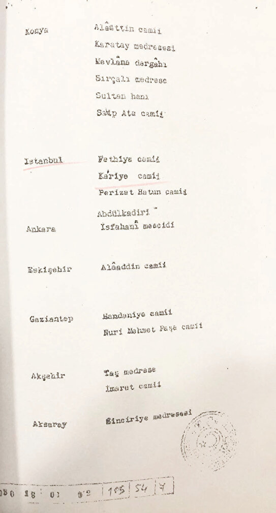 - O dönemki Cumhurbaşkanı İsmet İnönü ile kabine üyelerinin imzasını taşıyan belgelerde, müze ve müze deposuna dönüştürülen cami ve mescitler de yer alıyor. Bunlardan bazıları ilerleyen dönemlerde yeniden ibadete açıldı. 1945 Bakanlar Kurulu kararında geçen cami ve mescitler şöyle: