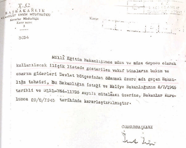 Kariye Camii’nin müzeye dönüştüren 29 Ağustos 1945 tarihli Bakanlar Kurulu kararına ulaşıldı. Kararda, “Milli Eğitim Bakanlığı’nca müze ve müze deposu olarak kullanılacak ilişik listede gösterilen vakıf binaların bakım ve onarım giderleri Devlet bütçesinden ödenmek üzere adı geçen Bakanlığa tahsisi bu Bakanlığın isteği ve Maliye Bakanlığı’nın 5/7/1945 tarihli ve 3121-744-11735 sayılı mütalaâsı üzerine, Bakanlar Kurulu’nca 29/8/1945 tarihinde kararlaştırılmıştır” ifadeleri yer alıyor.