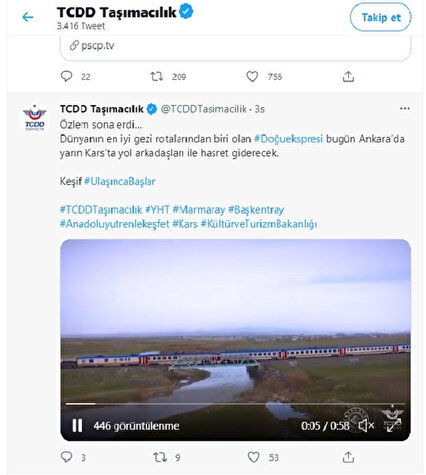 Ulaştırma ve Altyapı Bakanlığı Devlet Demiryolları Taşımacılık A.Ş. Genel Müdürlüğü sosyal medya hesabından; ’Özlem sona erdi. Dünyanın en iyi gezi rotalarından biri olan Doğu ekspresi bugün Ankara’da yarın Kars’ta yol arkadaşları ile hasret giderecek.’ Doğu Ekspresi’nin tanıtım videosunun paylaşımını yaptı.