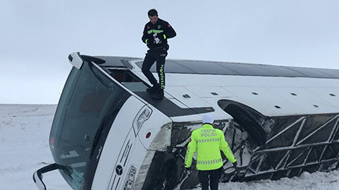 Iğdır’dan Sarıkamış’a yolcu götüren T.G.’nin kullandığı 65 NZ 926 plakalı yolcu otobüsü Kars’a 10 kilometre kala Ölçülü Köyü mevkinde yolun aşırılı buzlanmasından dolayı kayarak yan yattı.