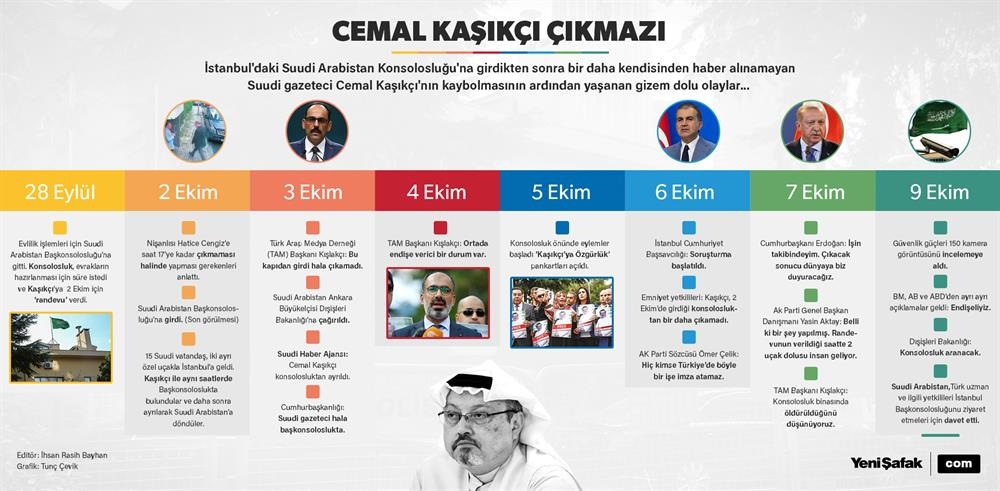 Suudi Arabistan'ın İstanbul Başkonsolosluğu'na bir hafta önce girdikten sonra kendisinden bir daha haber alınamayan Washington Post yazarı Cemal Kaşıkçı ile ilgili olay gizemini korumaya devam ediyor.