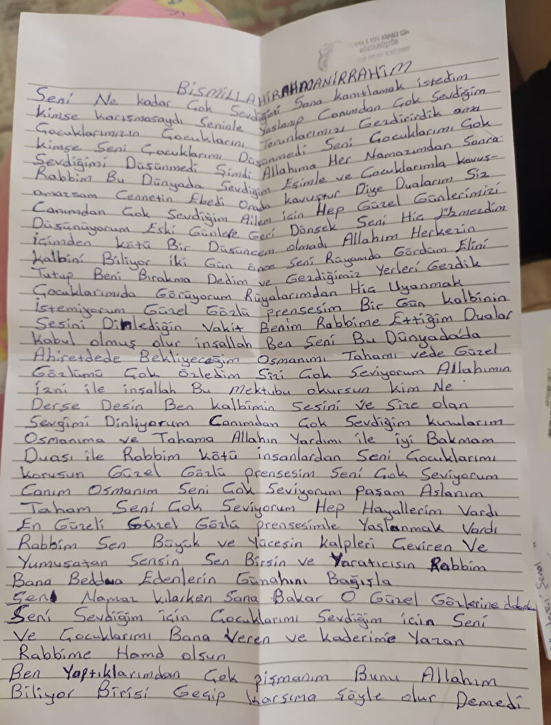 Şenol Yasak, tutuklu bulunduğu cezaevinden eşi Halime Yasak'a, mektup gönderdi. Yasak, mektubunda bacanağı ve kayınpederini, eşine olan sevgisini kanıtlamak için öldürdüğünü yazdı.