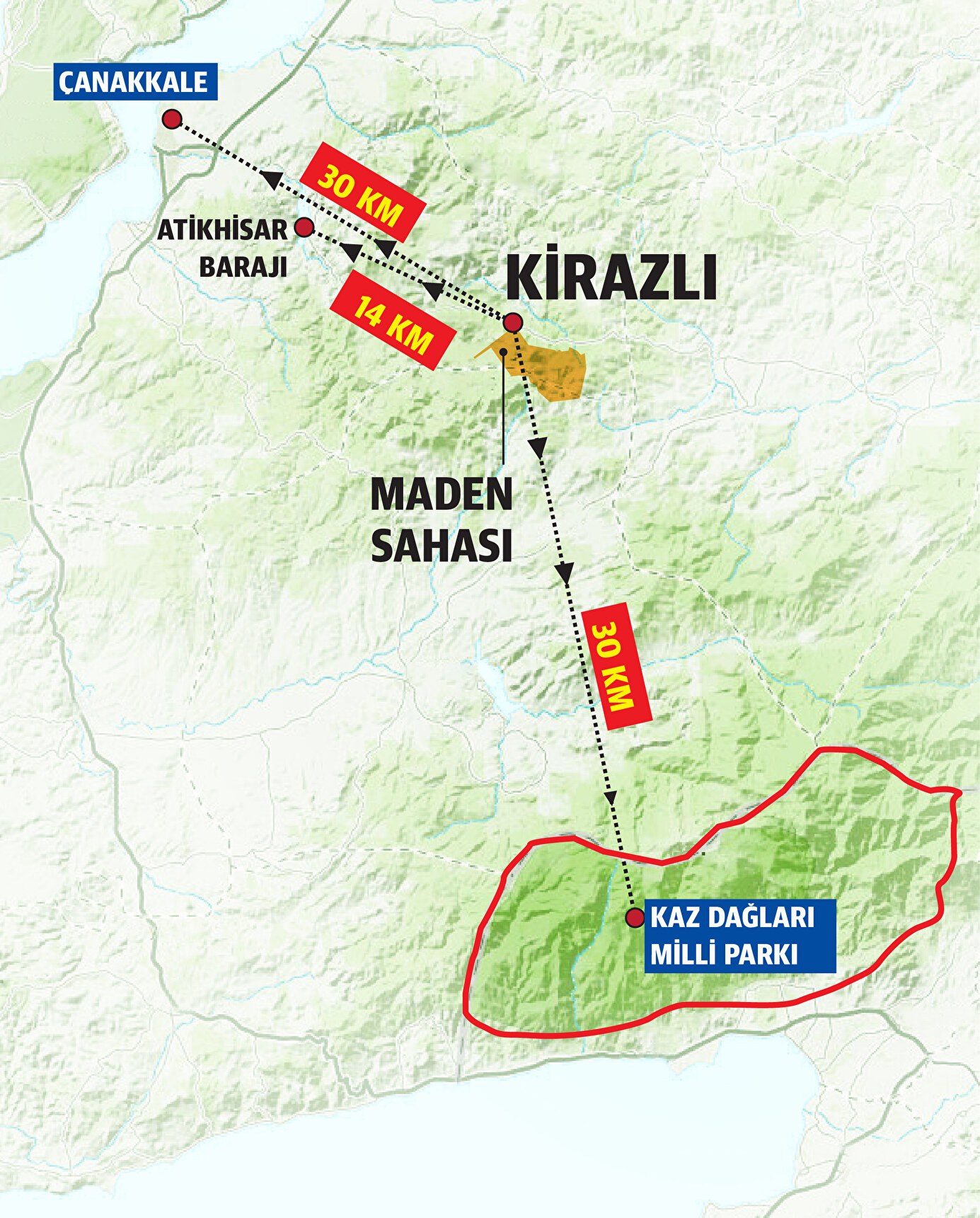 Tarım Orman Bakanlığı, Enerji Bakanlığı ve Çevre Bakanlığı’ndan alınan bilgilere göre maden sahasının Kaz Dağları ile ilgisi yok. Maden sahası Kirazla mevkiinde bulunuyor.