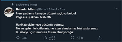 sonrası yaptığı açıklamaların ardından kovuldu. Twitter'dan açıklama yapan Altan, "Freni patlamış kamyon düzeni suçluyu buldu! Pegasus iş akdimi fesh etti. Hakikatı gizlemeye gücünüz yetmez. Ne vız gelen tehditleriniz, ne işten atmalarınız bizi susturamaz. Bu ülkeyi uçurumunuza teslim etmeyeceğiz" ifadelerini kullandı.