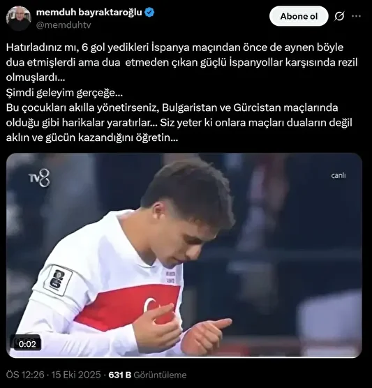 CHP yandaşı gazeteci Memduh Bayraktaroğlu, Gürcistan'ı 4-1'le geçen A Milli Takım'ın ilk golünü atan Kenan Yıldız'ın maç önü duasından rahatsız oldu. X hesabından Yıldız'ın dua ettiği videoyu alıntılayan Bayraktaroğlu, "Hatırladınız mı, 6 gol yedikleri İspanya maçından önce de aynen böyle dua etmişlerdi ama dua etmeden çıkan güçlü İspanyollar karşısında rezil olmuşlardı." ifadelerini kullandı.
