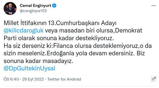 İYİ Parti Genel Başkanı Meral Akşener'in, cumhurbaşkanlığı seçimleriyle ilgili açıklamaları sonrası Demokrat Parti Genel Başkan Yardımcısı Cemal Enginyurt'tan dikkat çeken bir açıklama geldi. Sosyal medya hesabından yaptığı paylaşımda her koşulda CHP Genel Başkanı Kemal Kılıçdaroğlu'nun adaylığını destekleyeceklerini belirten Enginyurt, "Ha siz derseniz ki: 'Filanca olursa desteklemiyoruz.' O da sizin meseleniz. Erdoğan'la yola devam edersiniz." ifadelerini kullandı.