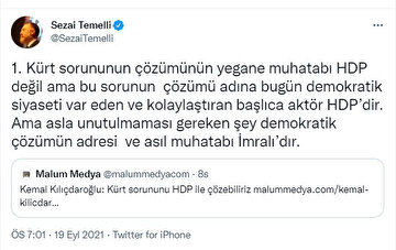 CHP Lideri'nin bu açıklamasına HDP cephesinden anında yanıt geldi. Kılıçdaroğlu'na PKK elebaşı Abdullah Öcalan'ı adres gösteren HDP'li Sezai Temelli, Twitter hesabından yaptığı açıklamada şu ifadelere yer verdi: