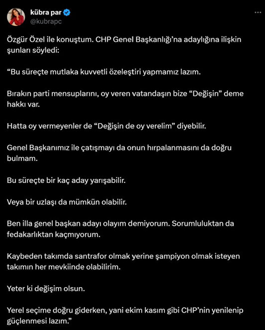 CHP'de 14 ve 28 Mayıs'ta alınan bozgun sonrası sular durulmuyor. Kemal Kılıçdaroğlu'na 'değişim' çağrısı yapan CHP Grup Başkanı Özgür Özel yeni bir açıklama daha yaptı. "CHP’nin yenilenip güçlenmesi lazım" diyen Özel, "Bu süreçte mutlaka kuvvetli özeleştiri yapmamız lazım. Ben illa genel başkan adayı olayım demiyorum. Sorumluluktan da fedakarlıktan kaçmıyorum." diye konuştu.