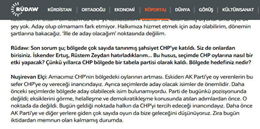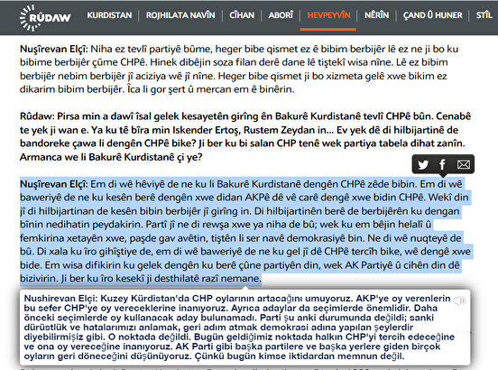 CHP Genel Başkanı Kemal Kılıçdaroğlu'nun başdanışmanı Nuşirevan Elçi PKK'nın sözde yayın organı Rudaw'da katıldığı bir röportajda skandal sözler sarf etti. CHP'nin Güney Doğu Anadolu bölgesindeki seçim çalışmasını değerlendiren elçi bölgeyi sözde '