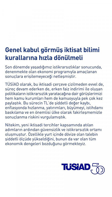 "Genel kabul görmüş iktisat bilimi kurallarına hızla dönülmeli" başlıklı açıklamada, "Son dönemde yaşadığımız istikrarsızlıklar sonucunda, denenmekte olan ekonomi programıyla amaçlanan sonuçlara erişilemeyeceği netleşmiştir." denildi.