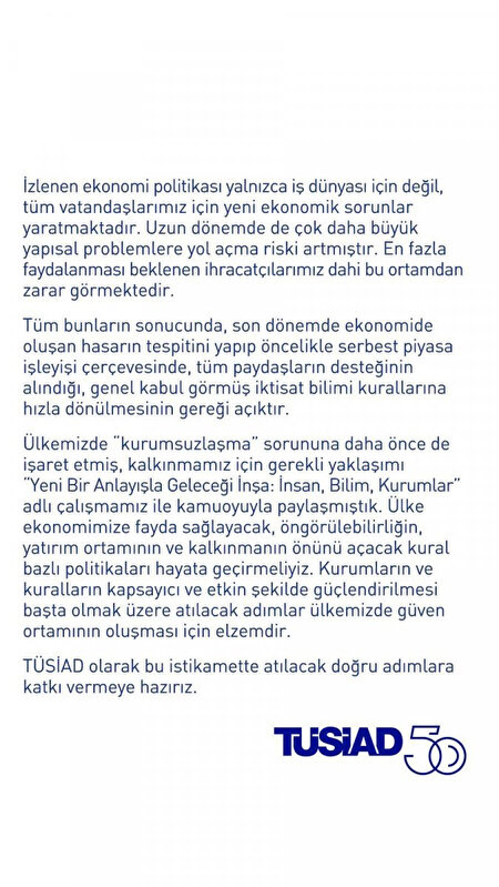 Yapılan yazılı açıklamada şu ifadelere yer verildi; "TÜSİAD olarak, bu iktisadi çerçeve çizilmeden evvel de, süreç devam ederken de, erken faiz indirimi ile oluşan politikaların istikrarsızlık yaratacağına dair görüşlerimizi hem kamu kurumları hem de kamuoyuyla pek çok kez paylaştık. Bu sürecin TL’de şiddetli değer kaybı, enflasyonda hızlanma, yatırımları, büyümeyi, istihdamı baskılama ve en önemlisi ülke olarak fakirleşmemizle sonuçlanma riskini vurgulamıştık.