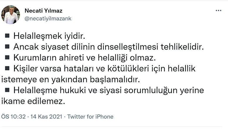CHP Genel Başkanı Kemal Kılıçdaroğlu'nun helalleşme yolculuğuna çıkması partisinde rahatsızlığa neden oldu. CHP 25. ve 26. Dönem Ankara Milletvekili Necati Yılmaz, sosyal medya hesabından Kılıçdaroğlu'na tepki gösterdi. Siyaset dilinin dinselleştirilmesinin tehlikeli olduğunu söyleyen Yılmaz, "Kurumların ahireti ve helalliği olmaz. Kişiler varsa hataları ve kötülükleri için helallik istemeye en yakından başlamalıdır." ifadesini kullandı.