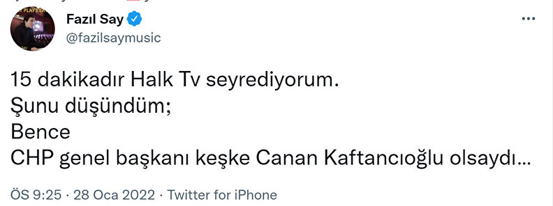 CHP Genel Başkanı Kemal Kılıçdaroğlu'nun konuk olduğu canlı yayını 15 dakika izleyen piyanist Fazıl Say, Twitter hesabından isyan etti. Say, "CHP Genel Başkanı keşke Canan Kaftancıoğlu olsaydı" ifadelerini kullandı.