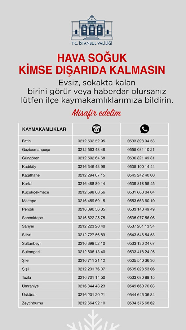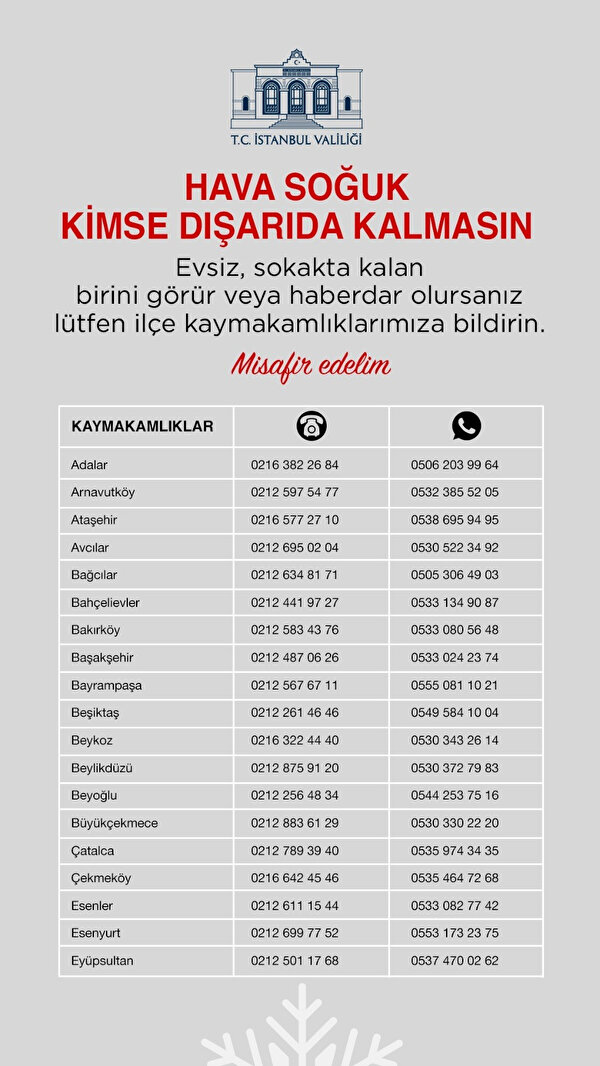 İstanbul Valiliği, 39 ilçenin iletişim bilgilerinin yer aldığı bu listeyi, “Hava Soğuk Kimse Dışarıda Kalmasın! Evsiz, sokakta kalan birisini görür veya haberdar olursanız, lütfen ALO 153, 155, 156, 183 ihbar hatları ve ilçe kaymakamlıklarımıza bildiriniz. #MisafirEdelim” notu ve etiketi ile sosyal medya hesaplarından paylaştı.