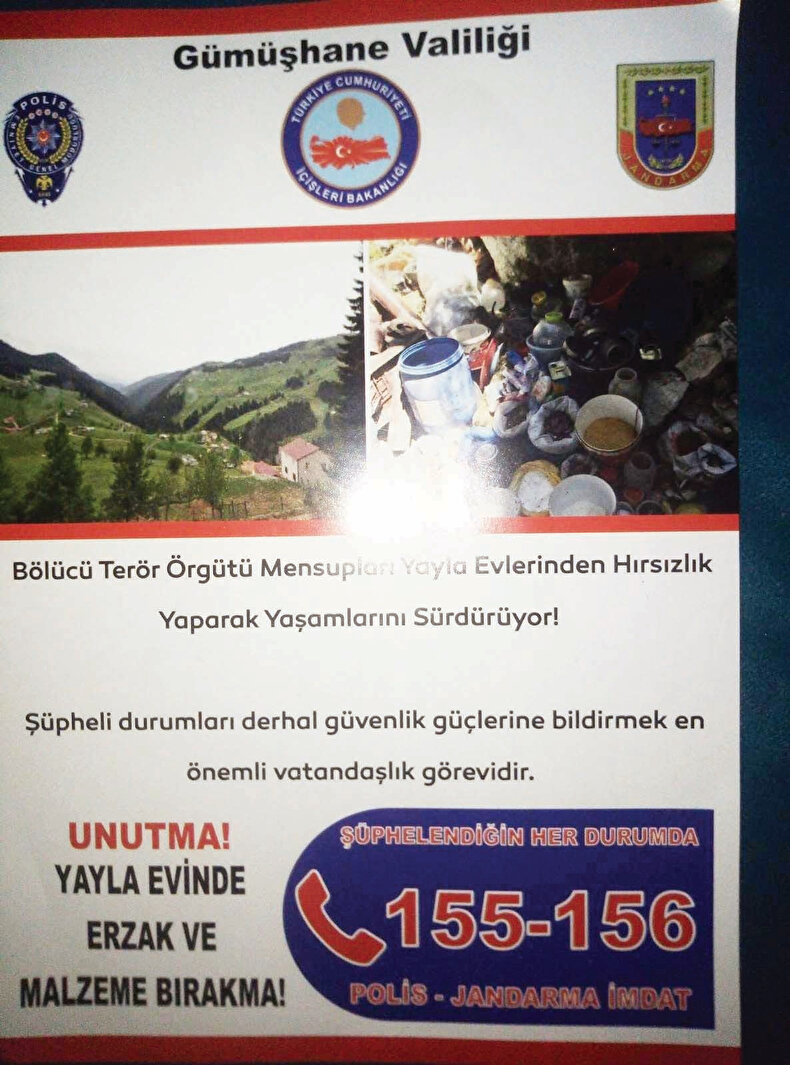- Bu arada 1800 kişilik Jandarma Özel Harekât (JÖH) ve komando birliği, Karadeniz yaylalarında ‘erzak’ operasyonu başlattı. Giresun, Gümüşhane, Trabzon, Tokat ve Ordu kırsalında yürütülen İHA destekli operasyonlarda güvenlik güçleri hem araziyi kontrol ediyor hem de vatandaşları ‘yayladan şehre inerken evde erzak bırakmamaları’ yönünde uyarıyor. Evlere dağıtılan ilanlarda, “Bölücü terör örgütü mensupları yayla evlerinden hırsızlık yaparak yaşamlarını sürdürüyor. Şüpheli durumları derhal güvenlik güçlerine bildirmek en önemli vatandaşlık görevidir. Unutma! Yayla evinde erzak ve malzeme bırakma” şeklinde uyarılar bulunuyor. Erzincan-Tunceli hattında sıkışan teröristlerin Karadeniz kırsalına sızabileceği belirtiliyor.