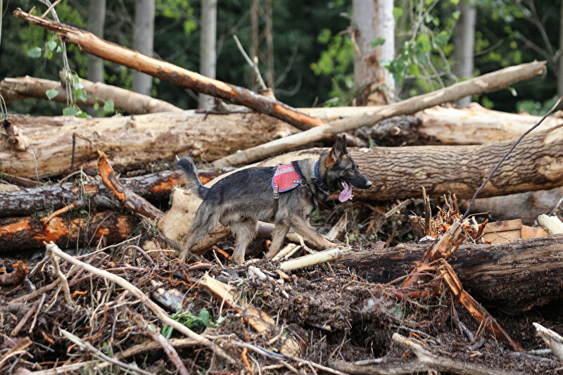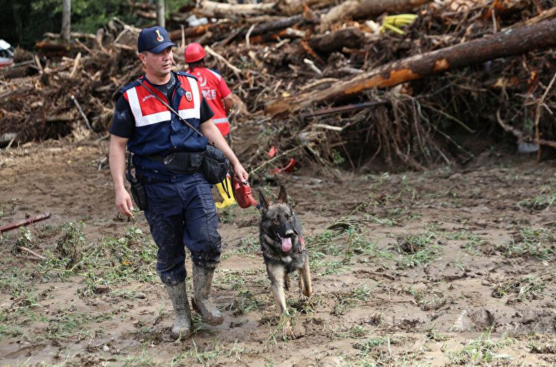 Arama çalışmaların Bursa İl Jandarma Komutanlığı'nın "DENEK" isimli kadavra arama köpeği de katıldı.