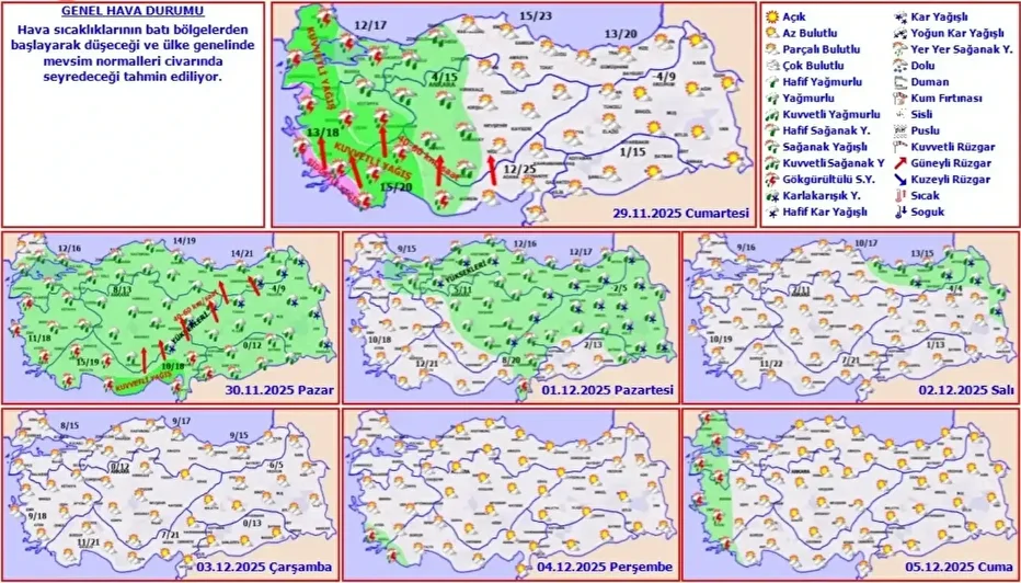 Hava sıcaklıklarının batı bölgelerden başlayarak düşeceği ve ülkemiz genelinde mevsim normalleri civarında seyredeceği tahmin ediliyor.