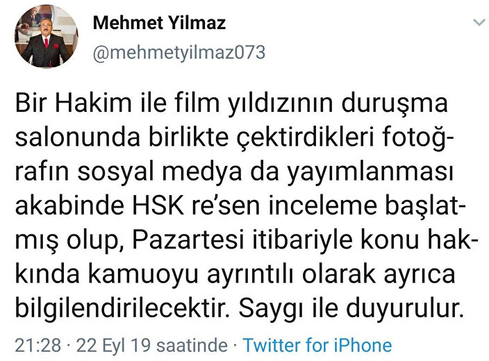 - Bir Hakim ile film yıldızının duruşma salonunda birlikte çektirdikleri fotoğrafın sosyal medya da yayımlanması akabinde HSK re’sen inceleme başlatmış olup, Pazartesi itibariyle konu hakkında kamuoyu ayrıntılı olarak ayrıca bilgilendirilecektir. Saygı ile duyurulur.