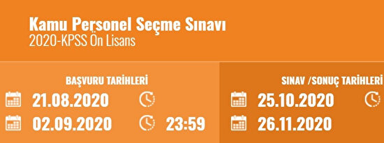 2020-KPSS Ön Lisans Sınavı, 25 Ekim 2020 tarihinde uygulanacaktır. Sınava başvurular, 21 Ağustos 2020 - 02 Eylül 2020 tarihlerinde yapılacaktır.