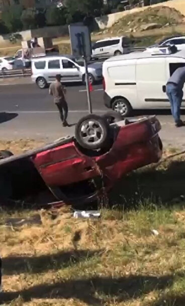 Büyükçekmece Kumburgaz'da E-5 karayolunda takla atan bir otomobil otobüs durağına daldı.