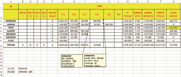 FETÖ’nün kurban kesimi için örgüt üyelerinden ya da örgüt dışındaki kişilerden topladığı paraları örgüt kasasına aktardığı, Kurban Bayramı’nda da kurban kesmediği tespit edildi. İddianameye giren kayıtlarda, toplanan kurban paraları “gelir” diye kaydedildi. Hatta bu tablolarda “kalan” isimli bir bölümün olduğu ve kurban için toplanan paralardan ne kadar kaldığına ilişkin tutarların belirtildiği görüldü. Tablolarda ayrıca “gelmesi gereken” ve “gelen” başlıkları dikkate alındığı, kurbana ilişkin toplanacak paranın bile öncesinden belirlendiği anlaşıldı.