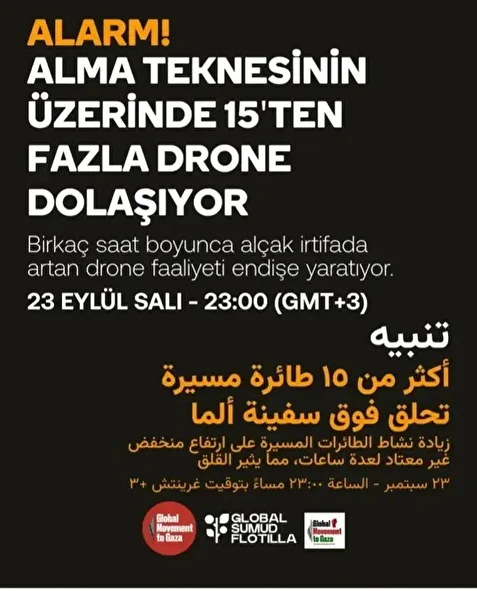 Yeni Şafak İnternet Servisi Müdürü Ersin Çelik, gece seyir halindeylen filonun üzerinde 15’ten fazla drone gözlemlendiğini ifade etti. Ayrıca bazı teknelere havadan barut kokulu bir madde bırakıldığı bildirildi.