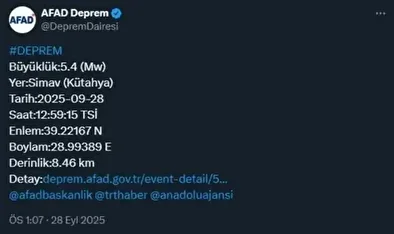 "Kütahya Simav'da 5,4 büyüklüğünde bir deprem meydan gelmiştir. Çevre illerden de hissedilen depremle ilgili olarak, AFAD ve ilgili kurumlarımızın tüm ekipleri saha taramalarına başlamıştır.