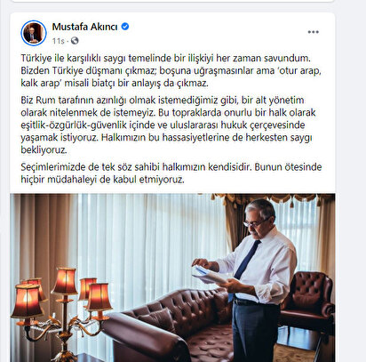 Cumhurbaşkanı Akıncı, sosyal medya hesabından yaptığı açıklamada, Türkiye ile karşılıklı saygı temelinde bir ilişkiyi her zaman savunduğunu söyledi. KKTC Cumhurbaşkanı, Rum tarafının azınlığı olmak istemedikleri gibi, bir alt yönetim olarak nitelenmek de istemediklerini dile getirerek, eşitlik- özgürlük ve güvenlik içinde yaşamak istediklerini kaydetti.