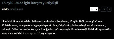 - Fikirde birlik ve mücadele platformu tarafından düzenlenen, 18 eylül 2022 pazar günü saat 15.00'da Saraçhane Parkı'nda gerçekleşecek olan yürüyüştür. Platform başkanı Kürşat Mican, mitingin "aileni ve neslini koru, sapkınlığa dur de" sloganıyla düzenleyeceğini bildirdi. Ayrıca RTÜK konuyla alakalı bir kamu spotu yayınlayacak.