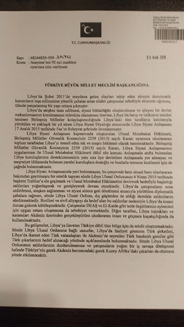 Libya tezkeresi Meclis'e gönderildi, Meclis Genel Kurulu 2 ocak perşembe olağanüstü toplanacak.
