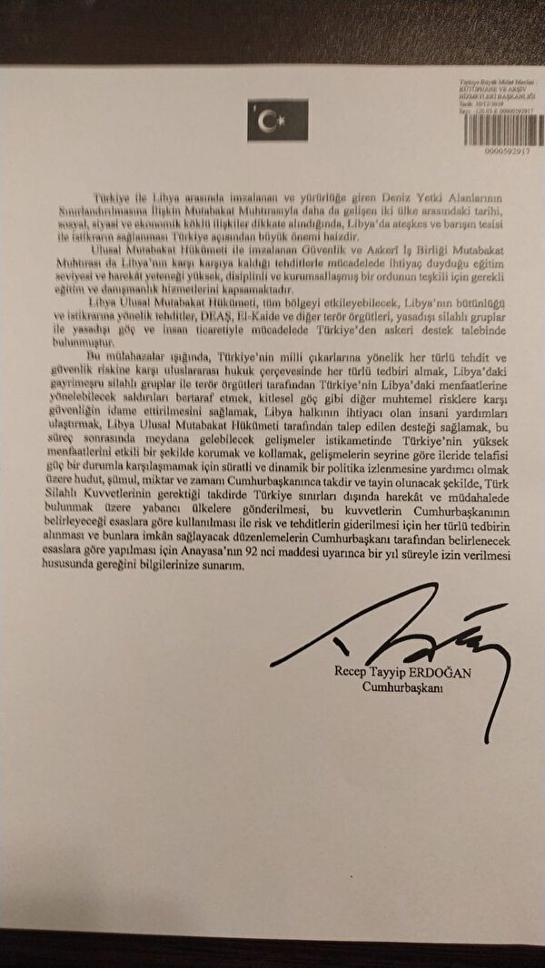 - TBMM Başkanı Şentop çağrı yazısında, "30 Aralık 2019 tarihinde Meclis Başkanlığımıza sunulan 3/1044 esas numaralı Cumhurbaşkanlığı tezkeresinin görüşülmesini teminen, Anayasa'nın 93'üncü ve Türkiye Büyük Millet Meclisi İçtüzüğü'nün 7'nci maddelerine göre Genel Kurulun toplantıya çağrılması ihtiyacı hasıl olmuştur. Bu sebeple 2 Ocak 2020 Perşembe günü saat 14.00'te Türkiye Büyük Millet Meclisi Genel Kurulu'nu toplantıya çağırıyorum" ifadesine yer verdi.