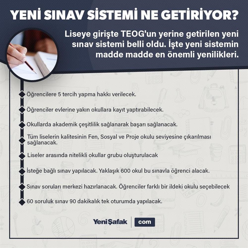 MEB Müsteşarı Yusuf Tekin, TEOG'un yerine gelen sistemin detaylarını anlattı. Tekin, "Dünyada kullanılan liseye geçiş sistemlerini inceledik. En fazla 120 bin öğrenci, sınavla öğrenci alan okullara yerleşecek. Okul başarı puanı, sınavla öğrenci alacak liselere yerleştirmede etkili olmayacak. Bu okullara sadece sınav sonuçlarına göre öğrenci alınacak" ifadesini kullandı.