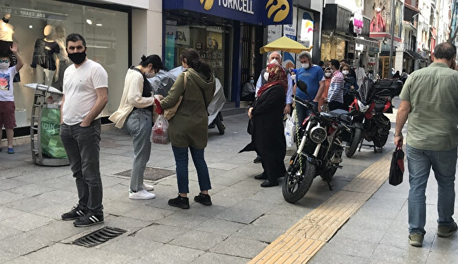 - Mağaza önlerinde bekleyen vatandaşların maske taktığı gözlemlendi. Kuyrukta olan vatandaşların sosyal mesafe kuralına uymamaları dikkat çekti.