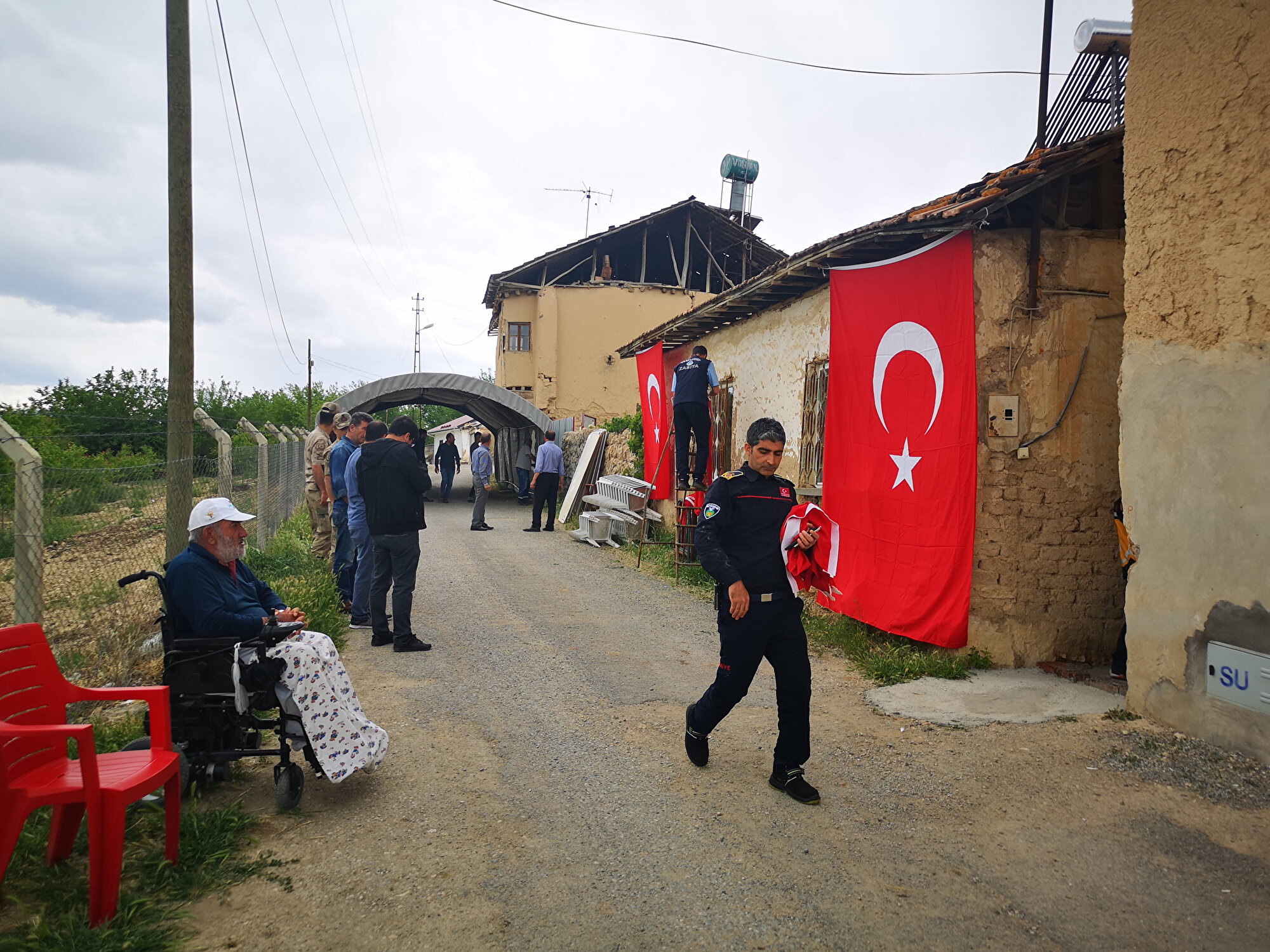Şehidin babası Cevat ile annesi Aynur Tekedereli'nin evine ve sokağa Türk bayrakları asıldı.