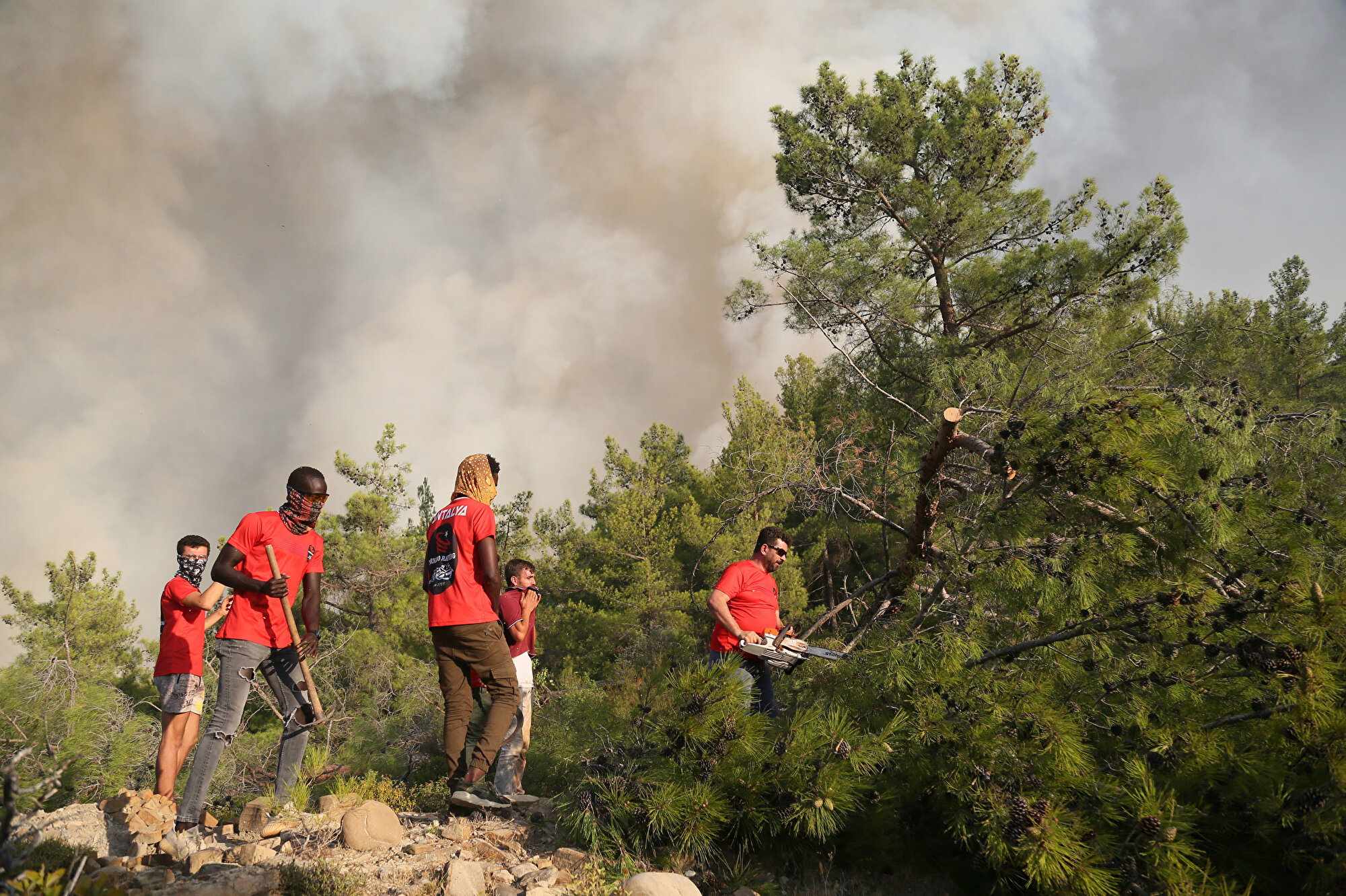 Raftingcilerin içinde Sudan, Gine gibi Afrika ülkeleri ve bazı Avrupa ülkelerinden Antalya'ya üniversite eğitimi için gelip yaz döneminde çalışan öğrenciler de bulunuyor. Rafting çalışanları ellerinde kazma, kürek, elektrikli testere ve baltalarla yangının Taşağıl, Beşkonak bölgesine ilerlemesine engel olmak için Çardak ve Kızıldağ ile Beydiğin aralarındaki bölgelerde iş makinaları ve bölge halkının da tampon bölgeler oluşturduğu çalışmalara katıldı.